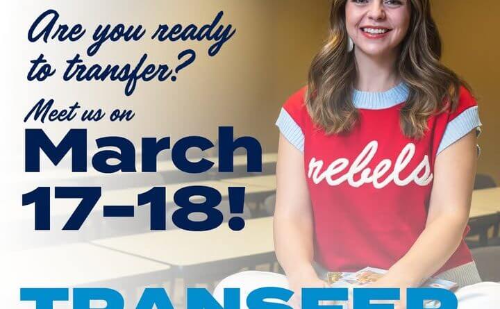 Ole Miss-Tupelo will host Transfer Days on Tuesday, March 17, from 10:45 a.m. to 12:45 p.m. at the ICC-Tupelo Academic and Student Services Building. The event continues on Wednesday, March 18, from 10:45 a.m. to 12:45 p.m. at the ICC-Fulton David Cole Student Services Building.