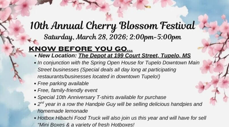 The 10th Annual Cherry Blossom Festival is scheduled for this Saturday at The Depot in downtown Tupelo. The event runs from 2 p.m. to 5 p.m., according to organizers.